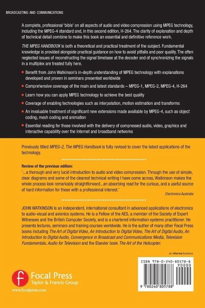 THE MPEG HANDBOOK is both a theoretical and practical treatment of the subject. Fundamental knowledge is provided alongside practical guidance on how to avoid pitfalls and poor quality. The often-neglected issues of reconstructing the signal timebase at the decoder and of synchronizing the signals in a multiplex are treated fully here.