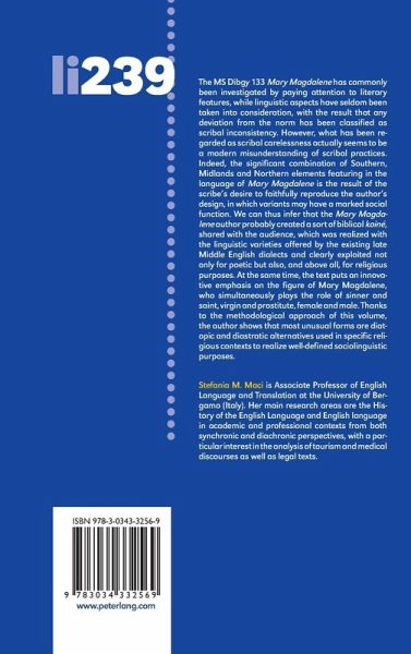 The MS 133 Digby Mary Magdalene has commonly been investigated by paying attention to literary features, while linguistic aspects have seldom been taken into consideration, with the result that any deviation from the norm has been classified as scribal inconsistency. However, what has been regarded as scribal carelessness actually seems to be a modern misunderstanding of scribal practices. Indeed, the significant combination of Southern, Midlands and Northern elements featuring in the language of Mary Magdalene is the result of the scribe's desire to faithfully reproduce the author's design, in which variants may have a marked social function. We can thus infer that the Mary Magdalene author probably created a sort of biblical koiné, shared with the audience, which was realized with the linguistic varieties offered by the existing late Middle English dialects and clearly exploited not only for poetic but also, and above all, for religious purposes. At the same time, the text puts an innovative emphasis on the figure of Mary Magdalene, who simultaneously plays the role of sinner and saint, virgin and prostitute, female and male. Thanks to the methodological approach of this volume, the author shows that most unusual forms are diatopic and diastratic alternatives used in specific religious contexts to realize well-defined sociolinguistic purposes.