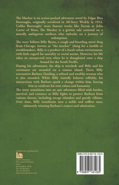The Mucker is an action-packed adventure novel by Edgar Rice Burroughs, originally serialized in All-Story Weekly in 1914. Unlike Burroughs' more famous works like Tarzan or John Carter of Mars, The Mucker is a grittier tale centered on a morally ambiguous antihero who embarks on a journey of redemption. The story follows Billy Byrne, a rough and brawling street thug from Chicago, known as "the mucker" (slang for a lowlife or troublemaker). Billy is a product of a harsh urban environment, with little regard for morality or social norms. However, his life takes an unexpected turn when he is shanghaied onto a ship bound for the South Pacific. During his adventures, the ship is wrecked, and Billy and his crewmates are stranded on a remote island. There, Billy encounters Barbara Harding, a refined and wealthy woman who is also stranded. While Billy initially behaves selfishly, his interactions with Barbara spark a change within him, forcing him to confront his own values and humanity. The story transitions into an epic adventure filled with battles, survival, and romance as Billy fights to protect Barbara from various threats, including savage islanders and greedy villains. Over time, Billy transforms into a noble and selfless man, ultimately winning Barbara's respect and admiration. The Mucker is often praised for its raw, compelling protagonist and its departure from the idealized heroes of many of Burroughs' other works. It's considered a classic of pulp fiction, blending gritty realism with high adventure.