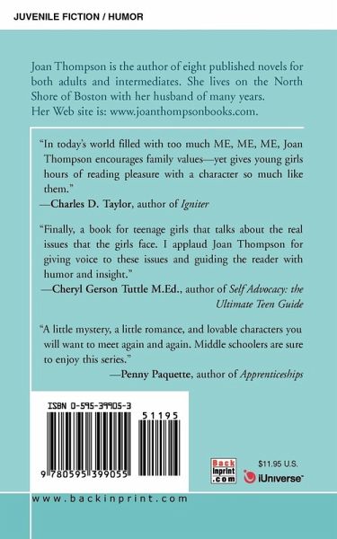 "In today's world filled with too much ME, ME, ME, Joan Thompson encourages family values-yet gives young girls hours of reading pleasure with a character so much like them."-Charles D. Taylor, author of Igniter "Finally, a book for teenage girls that talks about the real issues that the girls face. I applaud Joan Thompson for giving voice to these issues and guiding the reader with humor and insight."-Cheryl Gerson Tuttle M.Ed., author of Self Advocacy: the Ultimate Teen Guide "A little mystery, a little romance, and lovable characters you will want to meet again and again. Middle schoolers are sure to enjoy this series."-Penny Paquette, author of Apprenticeships