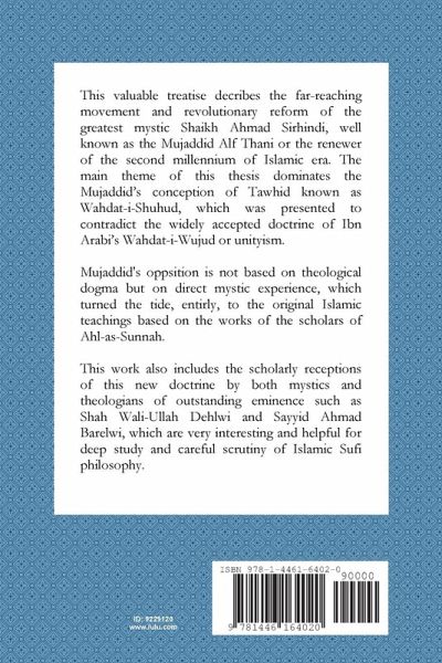 This valuable treatise decribes the far-reaching movement and revolutionary reform of the greatest mystic Shaikh Ahmad Sirhindi, well known as the Mujaddid Alf Thani or the renewer of the second millennium of Islamic era. The main theme of this thesis dominates the Mujaddid's conception of Tawhid known as Wahdat-i-Shuhud, which was presented to contradict the widely accepted doctrine of Ibn Arabi's Wahdat-i-Wujud or unityism. Mujaddid's oppsition is not based on theological dogma but on direct mystic experience, which turned the tide, entirly, to the original Islamic teachings based on the works of the scholars of Ahl-as-Sunnah. This work also includes the scholarly receptions of this new doctrine by both mystics and theologians of outstanding eminence such as Shah Wali-Ullah Dehlwi and Sayyid Ahmad Barelwi, which are very interesting and helpful for deep study and careful scrutiny of Islamic Sufi philosophy.