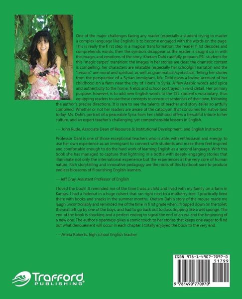 One of the major challenges facing any reader (especially a student trying to master a complex language like English) is to become engaged with the words on the page. This is really the fi rst step in a magical transformation: the reader fi rst decodes and comprehends words, then the symbols disappear as the reader is caught up in with the images and emotions of the story. Khetam Dahi carefully prepares ESL students for this "magic carpet" transition: the images in her stories are clear, the dramatic content is compelling, her characters are relatable (especially her schoolgirl narrator) and the "lessons" are moral and spiritual, as well as grammatical/syntactical. Telling her stories from the perspective of a Syrian immigrant, Ms. Dahi gives a loving account of her childhood on a farm near the city of Homs in Syria. A few Arabic words add spice and authenticity to the home, fi elds and school portrayed in vivid detail. Her primary purpose, however, is to add new English words to the ESL student’s vocabulary, thus equipping readers to use these concepts to construct sentences of their own, following the author’s precise directions. It is rare to see the talents of teacher and story-teller so artfully combined. Whether or not her readers are aware of the cataclysm that consumes her native land today, Ms. Dahi’s portrait of a peaceable Syria from her childhood offers a beautiful tribute to her culture, and an expert teacher’s challenging, yet comprehensible lessons in English. --- John Rude, Associate Dean of Resource & Institutional Development, and English Instructor Professor Dahi is one of those exceptional teachers who is able, with enthusiasm and energy, to use her own experience as an immigrant to connect with students and make them feel inspired and comfortable enough to do the hard work of learning English as a second language. With this book she has managed to capture that lightning in a bottle with deeply engaging stories that illuminate not only the international experience but the experiences at the very core of human nature. Rich storytelling and innovative pedagogy are the roots of this textbook sure to produce endless blossoms of fl ourishing English learners. ---Jeff Gray, Assistant Professor of English I loved the book! It reminded me of the time I was a child and lived with my family on a farm in Kansas. I had a hideout in a huge culvert that ran right next to a mulberry tree. I practically lived there with books and snacks in the summer months. Khetam Dahi’s story of the mouse made me laugh uncontrollably and reminded me of the time in fi rst grade when I fl opped down on the toilet, the seat left up by one of the boys, and had to go back out to class dripping like a wet sponge. The end of the book is shocking and a perfect ending to signal the end of an era and the beginning of a new one. The author’s openness gives a comic touch to her stories that keeps one eager to fi nd out what denouement will occur in each chapter. I totally enjoyed the book to the very end. --- Arleta Roberts, high school English teacher