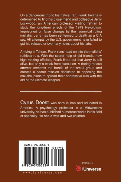 On a dangerous trip to his native Iran, Frank Tavana is determined to find his close friend and colleague Jerry Lockwood, an American professor visiting Tehran to study the long-term effects of the 1979 Revolution. Imprisoned on false charges by the tyrannical ruling mullahs, Jerry has been sentenced to death as a CIA spy. All attempts by the U.S. government have failed to get his release or even any news about his fate. Arriving in Tehran, Frank runs head on into the mullahs' ruthless rule. With the secret help of old friends, now high-ranking officials, Frank finds out that Jerry is still alive, but only a week from execution. A daring rescue attempt cements the bonds of the small group and creates a secret mission dedicated to opposing the mullahs' plans to spread their oppressive rule with the aid of the ultimate weapon.