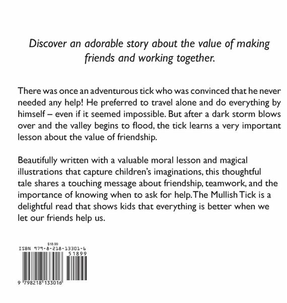Discover an adorable story about the value of making friends and working together. There was once an adventurous tick who was convinced that he never needed any help! He preferred to travel alone and do everything by himself - even if it seemed impossible. But after a dark storm blows over and the valley begins to flood, the tick learns a very important lesson about the value of friendship. Beautifully written with a valuable moral lesson and magical illustrations that capture children's imaginations, this thoughtful tale shares a touching message about friendship, teamwork, and the importance of knowing when to ask for help. The Mullish Tick is a delightful read that shows kids that everything is better when we let our friends help us. Book details: · Features a Heartwarming Story With a Valuable Moral Lesson and Beautiful Illustrations · Makes a Delightful Read For Boys & Girls Ages 3-8 · Shares The Value of Making Friends, Working Together, and Knowing When To Ask For Help · Great as a Bedtime Story and For Group Readings In The Classroom · Perfect as a Gift Idea For Your Children or Grandchildren · And Much More... As a fun resource for parents and educators who want to let children know that it's okay to ask for help and need other people, The Mullish Tick is a memorable book that reminds us all of the importance of friendship.