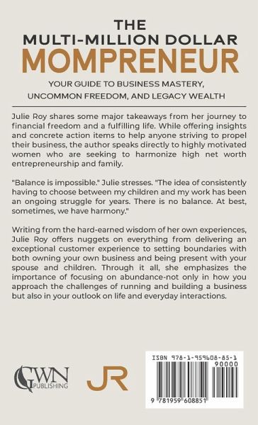 Julie Roy shares some major takeaways from her journey to financial freedom and a fulfilling life. While offering insights and concrete action items to help anyone striving to propel their business, the author speaks directly to highly motivated women who are seeking to harmonize high net worth entrepreneurship and family. "Balance is impossible." Julie stresses. "The idea of consistently having to choose between my children and my work has been an ongoing struggle for years. There is no balance. At best, sometimes, we have harmony." Writing from the hard-earned wisdom of her own experiences, Julie Roy offers nuggets on everything from delivering an exceptional customer experience to setting boundaries with both owning your own business and being present with your spouse and children. Through it all, she emphasizes the importance of focusing on abundance-not only in how you approach the challenges of running and building a business but also in your outlook on life and everyday interactions.