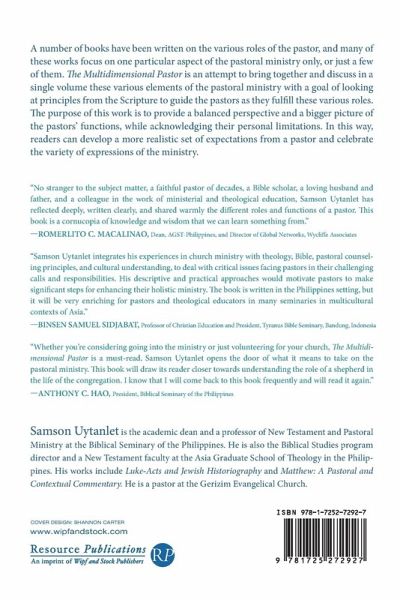 A number of books have been written on the various roles of the pastor, and many of these works focus on one particular aspect of the pastoral ministry only, or just a few of them. The Multidimensional Pastor is an attempt to bring together and discuss in a single volume these various elements of the pastoral ministry with a goal of looking at principles from the Scripture to guide the pastors as they fulfill these various roles. The purpose of this work is to provide a balanced perspective and a bigger picture of the pastors' functions, while acknowledging their personal limitations. In this way, readers can develop a more realistic set of expectations from a pastor and celebrate the variety of expressions of the ministry.