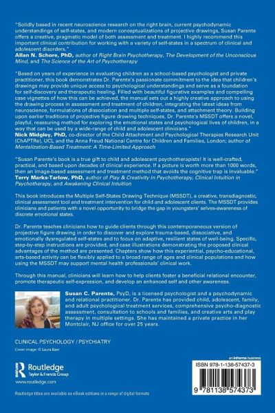 This book introduces the Multiple Self-States Drawing Technique (MSSDT), a creative, transdiagnostic, clinical assessment tool and treatment intervention for child and adolescent clients. The MSSDT provides clinicians and patients with a novel opportunity to bridge the gap in youngsters' selves-awareness of discrete emotional states. Dr. Parente teaches clinicians how to guide clients through this contemporaneous version of projective figure drawing in order to discover and explore trauma-based, dissociative, and emotionally dysregulated self-states and to focus on adaptive, resilient states of well-being. Specific, step-by-step instructions are provided, and case illustrations demonstrating the proposed clinical advantages of the method are presented. Chapters show how this experiential, psycho-educational, arts-based activity can be flexibly applied to a broad range of ages and clinical populations and how using the MSSDT may support mental health professionals' clinical work. Through this manual, clinicians will learn how to help clients foster a beneficial relational encounter, promote therapeutic self-expression, and develop an enhanced self and other awareness.