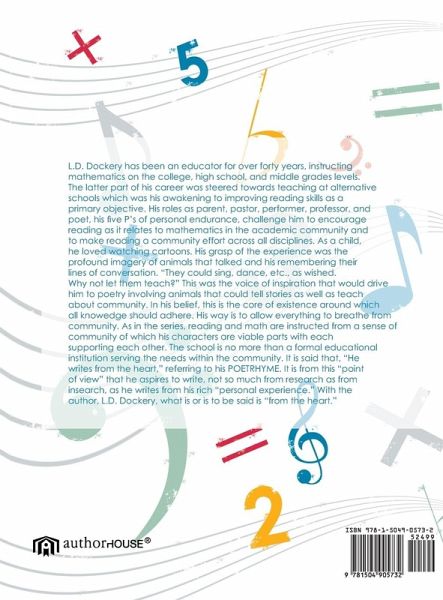 L.D. Dockery has been an educator for over forty years, instructing mathematics on the college, high school, and middle grades levels. The latter part of his career was steered towards teaching at alternative schools which was his awakening to improving reading skills as a primary objective. His roles as parent, pastor, performer, professor, and poet, his five P's of personal endurance, challenge him to encourage reading as it relates to mathematics in the academic community and to make reading a community effort across all disciplines. As a child, he loved watching cartoons. His grasp of the experience was the profound imagery of animals that talked and his remembering their lines of conversation. "They could sing, dance, etc., as wished. Why not let them teach?" This was the voice of inspiration that would drive him to poetry involving animals that could tell stories as well as teach about community. In his belief, this is the core of existence around which all knowedge should adhere. His way is to allow everything to breathe from community. As in the series, reading and math are instructed from a sense of community of which his characters are viable parts with each supporting each other. The school is no more than a formal educational institution serving the needs within the community. It is said that, "He writes from the heart," referring to his POETRHYME. It is from this "point of view" that he aspires to write, not so much from research as from insearch, as he writes from his rich "personal experience." With the author, L.D. Dockery, what is or is to be said is "from the heart."