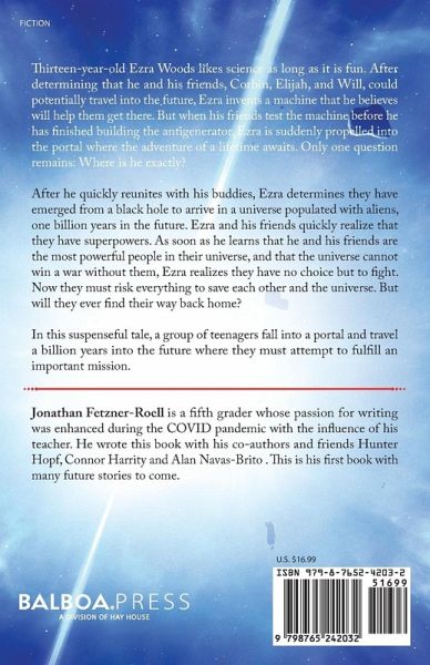 Thirteen-year-old Ezra Woods likes science as long as it is fun. After determining that he and his friends, Corbin, Elijah, and Will, could potentially travel into the future, Ezra invents a machine that he believes will help them get there. But when his friends test the machine before he has finished building the antigenerator, Ezra is suddenly propelled into the portal where the adventure of a lifetime awaits. Only one question remains: Where is he exactly? After he quickly reunites with his buddies, Ezra determines they have emerged from a black hole to arrive in a universe populated with aliens, one billion years in the future. Ezra and his friends quickly realize that they have superpowers. As soon as he learns that he and his friends are the most powerful people in their universe, and that the universe cannot win a war without them, Ezra realizes they have no choice but to fight. Now they must risk everything to save each other and the universe. But will they ever find their way back home? In this suspenseful tale, a group of teenagers fall into a portal and travel a billion years into the future where they must attempt to fulfill an important mission.