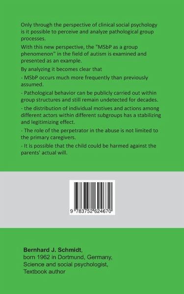 Only through the perspective of clinical social psychology is it possible to perceive and analyze pathological group processes.With this new perspective, the "MSbP as a group phenomenon" in the field of autism is examined and presented as an example.By analyzing it becomes clear that- MSbP occurs much more frequently than previously assumed.- Pathological behavior can be publicly carried out within group structures and still remain undetected for decades.- the distribution of individual motives and actions among different actors within different subgroups has a stabilizing and legitimizing effect.- The role of the perpetrator in the abuse is not limited to the primary caregivers.- It is possible that the child could be harmed against the parents' actual will.www.b-j-schmidt.net