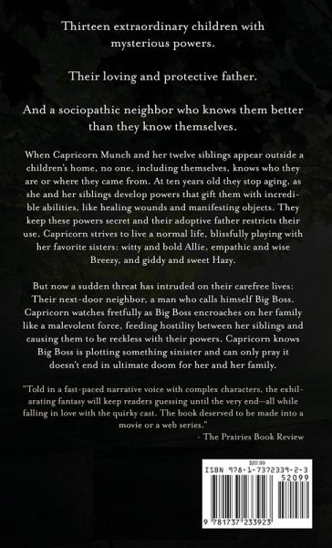 *Gold Award Winner of Teen Category in the 2021-2022 Reader Views Literary Awards * 2021 Story Monsters Approved Award in Tween Novels * 16th Annual National Indie Excellence Awards Finalist in Juvenile Fiction The Munchkins "has all the "ingredients" for a fantastical, magical, YA story that also caters to adults who absolutely love the Potter-esque world that happens maybe twice in a lifetime." - Reader Views Thirteen extraordinary children with mysterious powers. Their loving and protective father. And a sociopathic neighbor who knows them better than they know themselves. When Capricorn Munch and her twelve siblings appear outside a children's home, no one, including themselves, knows who they are or where they came from. At ten years old they stop aging, as she and her siblings develop powers that gift them with incredible abilities, like healing wounds and manifesting objects. They keep these powers secret and their adoptive father restricts their use. Capricorn strives to live a normal life, blissfully playing with her favorite sisters, witty and bold Allie, empathic and wise Breezy, and giddy and sweet Hazy. But now a sudden threat has intruded on their carefree lives: Their next-door neighbor, a man who calls himself Big Boss. Capricorn watches fretfully as Big Boss encroaches on her family like a malevolent force, feeding hostility between her siblings and causing them to be reckless with their powers. Capricorn knows Big Boss is plotting something sinister and can only pray it doesn't end in ultimate doom for her and her family. "Told in a fast-paced narrative voice with complex characters, the exhilarating fantasy will keep readers guessing until the very end-all while falling in love with the quirky cast. The book deserved to be made into a movie or a web series." - The Prairies Book Review