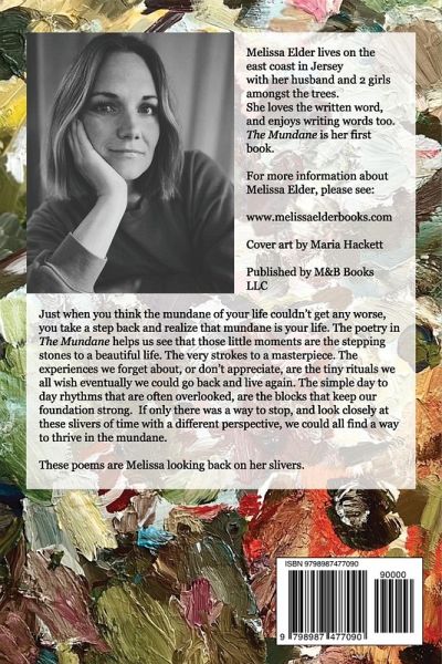 A beautiful debut collection of the simple moments in our lives. Poetry that will make you rethink the mundane and see it for what it is, a life unfolding. Just when you think the mundane of your life couldn't get any worse, you take a step back and realize that mundane is your life. The poetry in The Mundane helps us see that those little moments are the stepping stones to a beautiful life. The very strokes to a masterpiece. The experiences we forget about, or don't appreciate, are the tiny rituals we all wish eventually we could go back and live again. The day to day rhythms that are often overlooked, are the blocks that keep our foundation strong. If only there was a way to stop, and look closely at these slivers of time with a different perspective, we could all find a way to thrive in the mundane. These poems are Melissa looking back on her slivers.