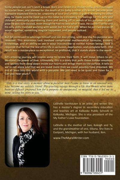 Some people just can't catch a break. Born and raised in a chicken coop, brain-damaged by scarlet fever, and blamed for the death of his baby brother, Ed Lantzer became what everyone expected him to be: unworthy of love and unable to give it. Knowing no other way, he made sure he lived up to this label by concealing his feelings for his wife and children, eventually abandoning them and setting off in search of his purpose-a purpose he was sure existed, even though he had no idea what it was. He couldn't write and his only skills involved working with wood, but he had a gift. When he put two pieces of wood together, something magical happened, and people noticed. But Ed continued to sabotage himself and lost everything, until one day his purpose was revealed. This enormous task involved complicated mathematical formulas, esoteric knowledge, and an ability to see in ways inaccessible to normal human beings. And it required that he live the rest of his life in seclusion, deprivation, and complete faith. The result was a masterpiece so exceptional, so profound, that it stands alone in the world. Ed's amazing journey will inspire some to renew their faith. It will move others to understand the power of love. Ultimately, this is a story that pulls those hidden emotions and secrets from deep down inside our hearts and brings them to the surface. It tells us we're not alone and that we are loved more than we could possibly have dreamed. We are all born into this world with a purpose. We just need to be quiet and listen for it. Can you hear yours?