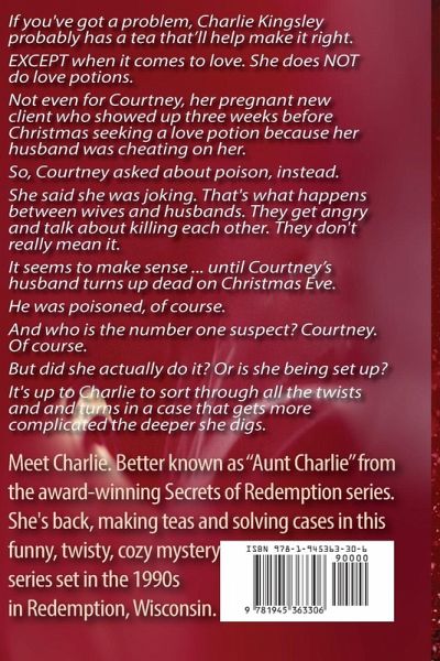 If you've got a problem, Charlie Kingsley probably has a tea that'll help make it right. EXCEPT when it comes to love. She does NOT do love potions. Not even for Courtney, her pregnant new client who showed up three weeks before Christmas seeking a love potion because her husband was cheating on her. So, Courtney asked about poison, instead. She said she was joking. That's what happens between wives and husbands. They get angry and talk about killing each other. They don't really mean it. It seems to make sense ... until Courtney's husband turns up dead on Christmas Eve. He was poisoned, of course. And who is the number one suspect? Courtney. Of course. But did she actually do it? Or is she being set up? It's up to Charlie to sort through all the twists and turns in a case that gets more complicated the deeper she digs. Meet Charlie. Better known as "Aunt Charlie" from the award-winning Secrets of Redemption series. She's back, making teas and solving cases in this funny, twisty, cozy mystery series set in the 1990s in Redemption, Wisconsin. Each book is a complete story and can be read as a standalone.