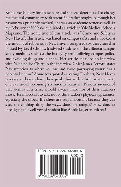 Annie was hungry for knowledge and she was determined to change the medical community with scientific breakthroughs. Although her passion was primarily medical, she was an academic writer as well. In the February of 2009 she published an article in Yale Medical School's Magazine. The ironic title of this article was "Crime and Safety in New Haven". This article was based on campus safety and it looked at the amount of robberies in New Haven, compared to other cities that housed Ivy Level schools. It advised students on the different campus safety methods such as; the buddy system, utilizing campus police, and avoiding drugs and alcohol. Her article included an interview with Yale's police Chief. In the interview Chief James Perrotti states "pay attention to where you are and avoid portraying yourself as a potential victim." Annie was quoted as stating "In short, New Haven is a city and cities have their perils, but with a little street smarts, one can avoid becoming yet another statistic." Perrotti mentioned that victims of a crime should always make not of their attacker's shoes. "It's important to take not of the attacker's physical appearance, especially the shoes. The shoes are very important because they can shed the clothing along the way... shoes are unique." How does an intelligent and well-versed student like Annie Le get murdered?