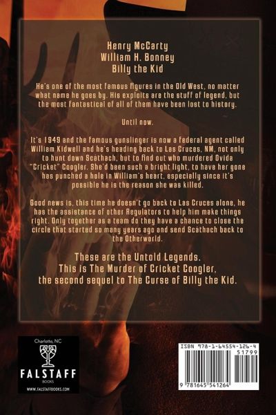 Henry McCartyWilliam H. BonneyBilly the Kid He's one of the most famous figures in the Old West, no matter what name he goes by. His exploits are the stuff of legend, but the most fantastical of all of them have been lost to history. Until now. It's 1949 and the famous gunslinger is now a federal agent called William Kidwell and he's heading back to Las Cruces, NM, not only to hunt down Scáthach, but to find out who murdered Ovida "Cricket" Coogler. She'd been such a bright light, to have her gone has punched a hole in William's heart, especially since it's possible he is the reason she was killed. Good news is, this time he doesn't go back to Las Cruces alone, he has the assistance of other Regulators to help him make things right. Only together as a team do they have a chance to close the circle that started so many years ago and send Scáthach back to the Otherworld. These are the Untold Legends.This is The Murder of Cricket Coogler,the second sequel to The Curse of Billy the Kid.