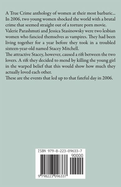 A True Crime anthology of women at their most barbaric... In 2006, two young women shocked the world with a brutal crime that seemed straight out of a torture porn movie. Valerie Parashmuti and Jessica Stasinowsky were two lesbian women who fancied themselves as vampires. They had been living together for a year before they took in a troubled sixteen-year-old named Stacey Mitchell. The attractive Stacey, however, caused a rift between the two lovers. A rift they decided to mend by killing the young girl in the warped belief that this would show how much they actually loved each other. These are the events that led up to that fateful day in 2006.