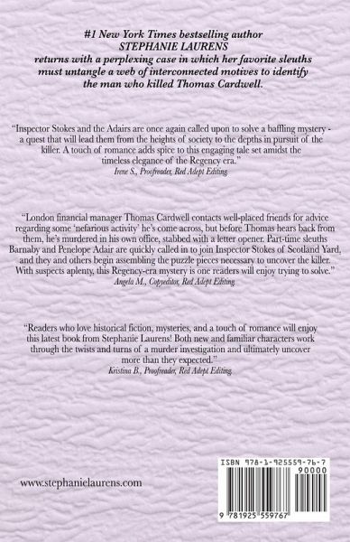 #1 NYT-bestselling author Stephanie Laurens returns with a perplexing case in which her favorite sleuths must untangle a web of interconnected motives to identify the man who killed Thomas Cardwell. When Thomas Cardwell, an upstanding man-of-business, is murdered, Roscoe enlists the aid of the best investigators in London - namely Barnaby and Penelope Adair and Inspector Stokes of Scotland Yard - to solve the puzzle of why anyone would want to kill a man as honest as Cardwell. Dispatched by Roscoe, London's gambling king, to learn what "nefarious activity" an upstanding man-of-business has stumbled upon, Jordan Draper-Roscoe's own man-of-business-arrives at Thomas Cardwell's office to discover Cardwell very recently murdered. Soon, Jordan finds himself working alongside the Adairs and Inspector Stokes as they search for clues as to why anyone would kill a man as unthreatening as Cardwell. Unexpectedly, Jordan finds himself drawn to Cardwell's family, especially Thomas's sister, Ruth, and as the investigation progresses, the greater Jordan's compulsion to find the murderer and bring the family resolution and respite grows. Clue by clue, motive by surprising motive, the investigators seek to identify Cardwell's murderer and, along the way, uncover the "nefarious activity" he'd sought to bring to the authorities' attention. But in a case cluttered with intertwined motives and a web of potential suspects related to each other as well as the victim, finding the kernel of truth amid the chaff is no easy matter. Only through enlisting the help of the investigators' wider circle of supporters do they make any headway, and on the heels of uncovering a cascade of crimes, they finally-finally-close in on the man who murdered Thomas Cardwell. A historical novel of 77,000 words interweaving mystery, crime, and a touch of romance.