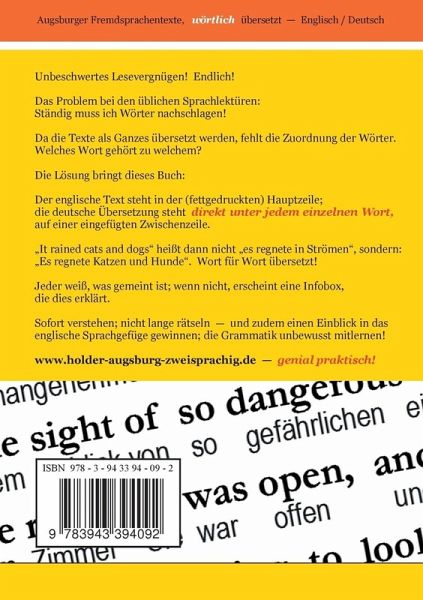 Der englische Text steht in der (fettgedruckten) Hauptzeile; die deutsche Übersetzung steht DIREKT UNTER JEDEM EINZELNEN WORT, auf einer eingefügten Zwischenzeile. It rained cats and dogs heißt dann nicht es regnete in Strömen , sondern: Es regnete Katzen und Hunde . Wort für Wort übersetzt.