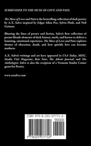 SURRENDER TO THE MUSE OF LOVE AND PAIN. The Muse of Love and Pain is the bestselling collection of dark poetry by A.X. Salvo inspired by Edgar Allan Poe, Sylvia Plath, and Neil Gaiman. Blurring the lines of poetry and fiction, Salvo's first collection of poems blends elements of dark fantasy, myth, and horror to deliver a haunting, emotional experience. The Muse of Love and Pain explores themes of obsession, death, and how quickly love can become madness. A.X. Salvo's writings and art have appeared in USA Today, MISC, Studio Visit Magazine, Bete Noir, The Adroit Journal, and The Anthologist. Salvo is also the recipient of a Vermont Studio Center grant for Poetry.