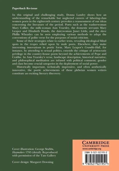 In this original and challenging study, Donna Landry shows how an understanding of the remarkable but neglected careers of laboring-class women poets in the eighteenth century provokes a reassessment of our ideas concerning the literature of the period. Poets such as the washerwoman Mary Collier, the milkwoman Ann Yearsley, the domestic servants Mary Leapor and Elizabeth Hands, the dairywoman Janet Little, and the slave Phyllis Wheatley can be seen adapting the conventions of polite verse for the purposes of social criticism. Some of their strategies relate to earlier texts, revealing ideological blind spots in the tropes of male poets. Elsewhere, they made interesting innovations in poetic form. Mary Leapor's 'Crumble Hall', for instance, by attending to sexual politics, extends the critique of aristocratic privilege in the country-house poem beyond that of Pope and Crabbe. In Ann Yearsley's verse, landscape description, historical narrative, and philosophical meditation are infused with political comment. Historically important, technically impressive and often aesthetically innovative, the poetic achievements of these plebeian women writers constitute an exciting literary discovery.