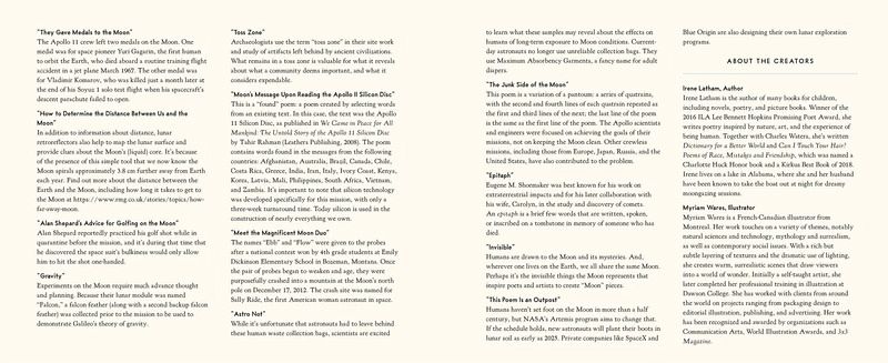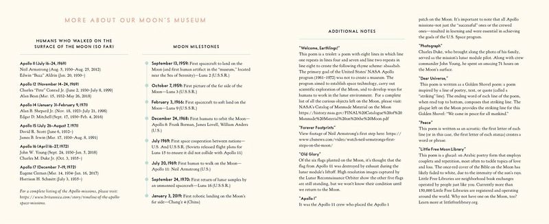 The most curious museum on Earth isn't on the earth at all; it's on the moon. A 2024 Notable Poetry Book, National Council of Teachers of English Honor Award, 2024 Lee Bennett Hopkins Poetry Award (Pennsylvania State University Libraries and the Pennsylvania Center for the Book) Nominee, Intermediate Division, 2024-2025 Keystone to Reading Elementary Book Awards "The poetry and facts complement each other and make for a nice flow of information and fun, resulting in sometimes goofy poetry....A lovely picture book that mixes poetry and history about the moon."-School Library Journal¿ "A provocative tally of treasures and trash." -Kirkus Reviews Footprints forever etched in time. A commemorative patch from a tragic flight. Two golf balls, still lodged in frozen dust 238,900 miles away. From the amusing to the poignant, The Museum on the Moon introduces readers to the mysterious objects left on the lunar surface since humans arrived in 1969. Part history, part poetry, heartwarming and haunting, and illustrated with breathtaking graphite drawings, The Museum on the Moon is a moving exhibit of humankind's most famous quest for knowledge and our place in the universe. From the book: The primary goals of the United States' NASA Apollo program (1961-1972) were to establish space technology, carry out scientific exploration of the moon, and to develop ways for humans to work in the lunar environment. Six missions-Apollos 11, 12, 14, 15, and 17-landed American astronauts on the moon. The astronauts carried with them a variety of items that are now artifacts-some personal mementos, some tools and equipment for the purpose of moon transport and experimentation, and other things, like human waste products, unavoidable. Because the moon has virtually no atmosphere, these things remain on the moon, just as they were, and will presumably continue to be there for years to come. The moon truly is a museum!