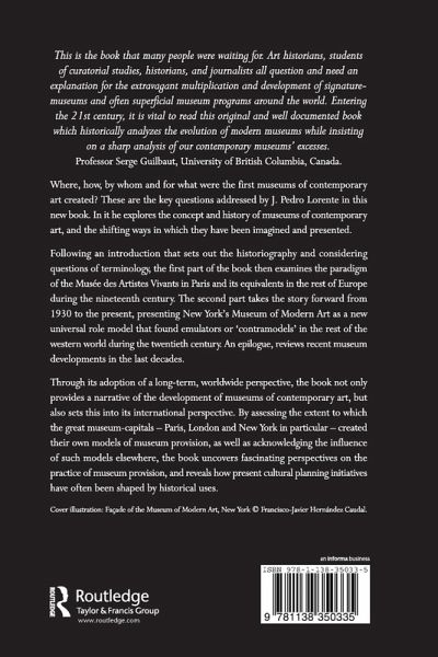 Where, how, by whom and for what were the first museums of contemporary art created? These are the key questions addressed by J. Pedro Lorente in this new book. In it he explores the concept and history of museums of contemporary art, and the shifting ways in which they have been imagined and presented. Following an introduction that sets out the historiography and considering questions of terminology, the first part of the book then examines the paradigm of the Musée des Artistes Vivants in Paris and its equivalents in the rest of Europe during the nineteenth century. The second part takes the story forward from 1930 to the present, presenting New York's Museum of Modern Art as a new universal role model that found emulators or 'contramodels' in the rest of the Western world during the twentieth century. An epilogue, reviews recent museum developments in the last decades. Through its adoption of a long-term, worldwide perspective, the book not only provides a narrative of the development of museums of contemporary art, but also sets this into its international perspective. By assessing the extent to which the great museum-capitals - Paris, London and New York in particular - created their own models of museum provision, as well as acknowledging the influence of such models elsewhere, the book uncovers fascinating perspectives on the practice of museum provision, and reveals how present cultural planning initiatives have often been shaped by historical uses.