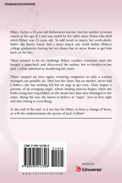 Hilary Taylor, a 25 year old Midwestern teacher, lost her mother to breast cancer at the age of 2 and was raised by her older sister Diana who died when Hilary was 15 years old. To add insult to injury, her work-aholic father she barely knew, had a heart attack one week before Hilary's college graduation leaving her no choice but to move home to get him back on his feet. There seemed to be no challenge Hilary couldn't overcome until she bought a paperback and discovered the author, her ex-brother-in-law Jack Collins admitted to murdering her sister. Hilary stepped up once again, swearing vengeance as only a woman wronged can possibly do. She's lost her sister, has no mother, never had a father- she has nothing left but an urge to get even. Thus, begins a journey of an avenging angel, whose healing process begins when she finds a long lost ring hidden in the music box that once belonged to her sister. Along the way she learns to believe in "signs", love at first sight and that timing is everything. At the end of the trail, is it too late for Hilary to have a change of heart, or will she underestimate the power of Jack Collins?