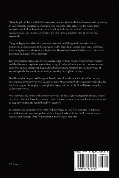 "Music Royalty Collection Guide" is an essential resource for individuals in the music industry seeking to understand the complexities of music royalty collection in the digital era. The book offers a comprehensive look at the various types of royalties, including mechanical, performance, synchronization, and print music royalties, and how they are generated through streams and downloads. The guide begins with a historical perspective on music publishing and its evolution due to technological advancements. It then navigates readers through the current music rights landscape, introducing key stakeholders such as Performing Rights Organizations (PROs), record labels, music publishers, and digital service providers. Key points include detailed instructions on registering works to ensure accurate royalty collection and distribution, strategies for maximizing earnings from both domestic and international sources, and advice on negotiating publishing deals and understanding contracts. The book also warns of common pitfalls that can hinder artists from receiving their rightful earnings. Notable insights are provided through real-world examples and case studies that illustrate how theoretical concepts apply in practice. Additionally, "Music Royalty Collection Guide" looks ahead to the future impact of emerging technologies like blockchain and artificial intelligence on royalty collection processes. Written by industry experts with extensive experience in music rights management, this guide serves as both an educational tool for newcomers and a reference manual for seasoned professionals aiming to keep up with industry standards and best practices. In summary, this book empowers readers with knowledge to transform what may seem like an overwhelming task into a manageable one. It is designed to be an indispensable asset for anyone serious about earning a living from their art in today's digital economy.