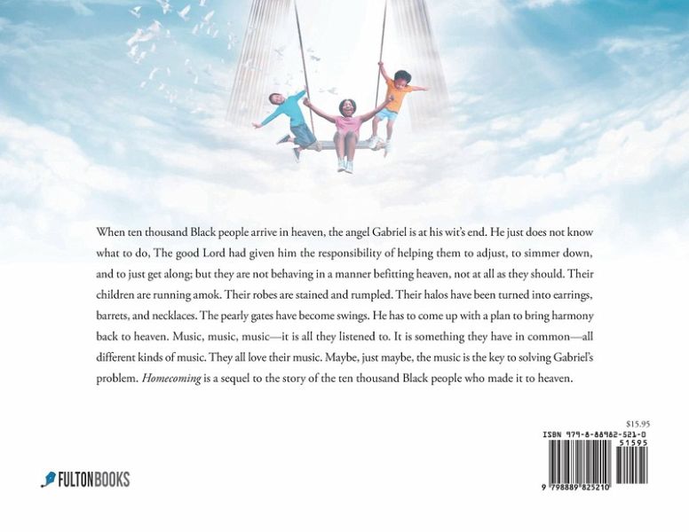 When ten thousand Black people arrive in heaven, the angel Gabriel is at his wit's end. He just does not know what to do, The good Lord had given him the responsibility of helping them to adjust, to simmer down, and to just get along; but they are not behaving in a manner befitting heaven, not at all as they should. Their children are running amok. Their robes are stained and rumpled. Their halos have been turned into earrings, barrets, and necklaces. The pearly gates have become swings. He has to come up with a plan to bring harmony back to heaven. Music, music, music--it is all they listened to. It is something they have in common--all different kinds of music. They all love their music. Maybe, just maybe, the music is the key to solving Gabriel's problem. Homecoming is a sequel to the story of the ten thousand Black people who made it to heaven.