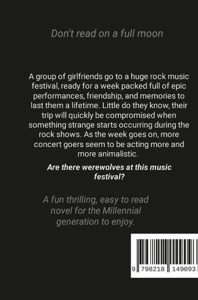 When a group of friends pack up and road trip to a week-long music festival, they expect a crazy, fun time full of memories to last a lifetime. As the week goes on, something strange starts to surface. Are there werewolves at the festival? What is causing all these people to change?