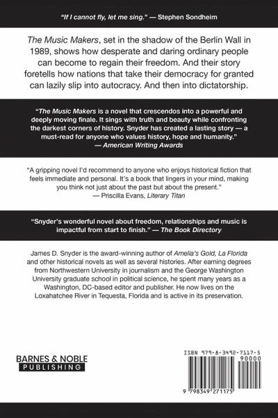 Like frogs in a simmering cauldron, We The People stare dumbly into our smartphones as autocrats slowly turn up the heat. Te Music Makers tells the story of how the end result - dictatorship - smothered the lives of ordinary East Berliners and how they struggled be free of it. The story unfolds as Greta,a civics teacher known for her eccentricities, spots a man playing an old-fashioned barrel organ on a busy street. She becomes enthralled as passers-by pause and gather. Soon they are filling the street and singing old German songs - a refreshing respite from their grueling lives in a Grim, gray city brooded over by the notorious Stasi secret police. Before long a cluster of amateur music makers is drawing dozens of picnickers on Sunday afternoons. But soon Stasi and KGB agents are filtering smong them. And in time we see past lives exposed, their secrets bared, their souls tortured. These and other undercurrents of dictatorship ignite events that lead to the fall of the Berlin Wall in November 1989. The matic makers are but bit players in this cataclysmic drama, but their story shows how precious democracy is and how crucial it is for:ordinary people" to uphold it.
