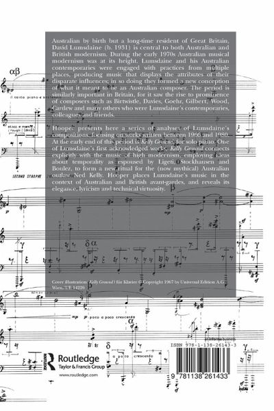 Australian by birth but a longtime resident of Great Britain, David Lumsdaine (b.1931) is central to both Australian and British modernism. During the early 1970s Australian musical modernism was at its height. Lumsdaine and his Australian contemporaries were engaged with practices from multiple places, producing music that displays the attributes of their disparate influences; in so doing they formed a new conception of what it meant to be an Australian composer. The period is similarly important in Britain, for it saw the rise to prominence of composers such as Birtwistle, Davies, Goehr, Gilbert, Wood, Cardew and many others who were Lumsdaine's contemporaries, colleagues and friends. Hooper presents here a series of analyses of Lumsdaine's compositions, focusing on works written between 1966 and 1980. At the early end of this period is Kelly Ground, for solo piano. One of Lumsdaine's first acknowledged works, Kelly Ground connects explicitly with the music of high modernism, employing ideas about temporality as espoused by Ligeti, Stockhausen and Boulez, to form a new ritual for the (now mythical) Australian outlaw Ned Kelly. Hooper places Lumsdaine's music in the context of Australian and British avant-gardes, and reveals its elegance, lyricism and technical virtuosity.