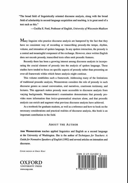 Recently there has been a growing interest among discourse analysts in incorporating prosody into the analysis of spoken language. Wennerstrom considers the role of prosody in a variety of discourse genres and offers an over-all framework within which future analysis might continue.