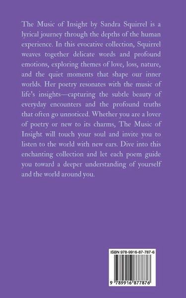 The Music of Insight by Sandra Squirrel is a lyrical journey through the depths of the human experience. In this evocative collection, Squirrel weaves together delicate words and profound emotions, exploring themes of love, loss, nature, and the quiet moments that shape our inner worlds. Her poetry resonates with the music of life's insights-capturing the subtle beauty of everyday encounters and the profound truths that often go unnoticed. Whether you are a lover of poetry or new to its charms, The Music of Insight will touch your soul and invite you to listen to the world with new ears. Dive into this enchanting collection and let each poem guide you toward a deeper understanding of yourself and the world around you. Copyright © 2024 Book Fairy Publishing