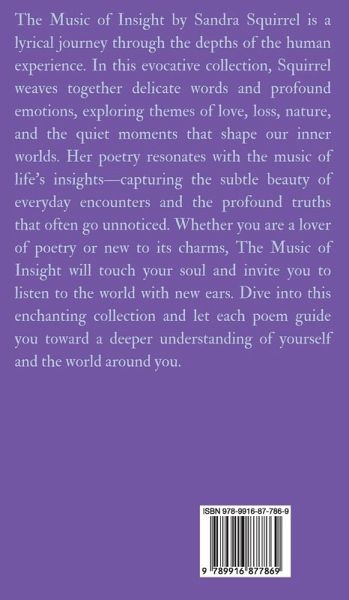 The Music of Insight by Sandra Squirrel is a lyrical journey through the depths of the human experience. In this evocative collection, Squirrel weaves together delicate words and profound emotions, exploring themes of love, loss, nature, and the quiet moments that shape our inner worlds. Her poetry resonates with the music of life's insights-capturing the subtle beauty of everyday encounters and the profound truths that often go unnoticed. Whether you are a lover of poetry or new to its charms, The Music of Insight will touch your soul and invite you to listen to the world with new ears. Dive into this enchanting collection and let each poem guide you toward a deeper understanding of yourself and the world around you. Copyright © 2024 Book Fairy Publishing