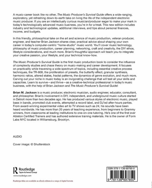 This new edition includes industry and technological updates, additional interviews, and tips about personal finances, income, and budgets. In this friendly, philosophical take on the art and science of music production, veteran producer, engineer, and teacher Brian Jackson shares clear, practical advice about shaping your own career in today's computer-centric "home-studio" music world. You'll cover music technology, philosophy of music production, career planning, networking, craft and creativity, the DIY ethos, lifestyle considerations, and much more. Brian's thoughtful approach will teach you to integrate your creative passion, your lifestyle, and your technical know-how. The Music Producer's Survival Guide is the first music-production book to consider the influence of complexity studies and chaos theory on music-making and career development. It focuses on practicality while traversing a wide spectrum of topics, including essential creative process techniques, the TR-808, the proliferation of presets, the butterfly effect, granular synthesis, harmonic ratios, altered states, fractal patterns, the dynamics of genre evolution, and much more. Carving out your niche in music today is an invigorating challenge that will test all your skills and capacities.