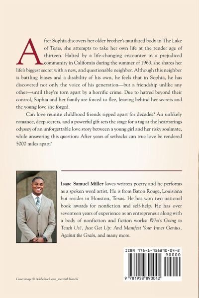 After Sophia discovers her older brother's mutilated body in The Lake of Tears, she attempts to take her own life at the tender age of thirteen. Halted by a life-changing encounter in a prejudice community in California during the summer of 1963, she shares her life's biggest secret with a new, and questionable neighbor. Although this neighbor is battling biases and a disability of his own, he feels that in Sophia, he has discovered not only the voice of his generation-but a friendship unlike any other-until their torn apart by a horrific crime. Due to hatred beyond their control, Sophia and her family are forced to flee, leaving behind her secrets and the young love she forged. Can love reunite childhood friends ripped apart for decades? An unlikely romance, deep secrets, and a powerful gift sets the stage for a tug at the heartstrings odyssey of an unforgettable love story between a young girl and her risky soulmate, while answering this question: After years of setbacks can true love be rendered 5000 miles apart?