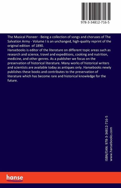 The Musical Pioneer - Being a collection of songs and choruses of The Salvation Army - Volume I is an unchanged, high-quality reprint of the original edition of 1890.Hansebooks is editor of the literature on different topic areas such as research and science, travel and expeditions, cooking and nutrition, medicine, and other genres. As a publisher we focus on the preservation of historical literature. Many works of historical writers and scientists are available today as antiques only. Hansebooks newly publishes these books and contributes to the preservation of literature which has become rare and historical knowledge for the future.