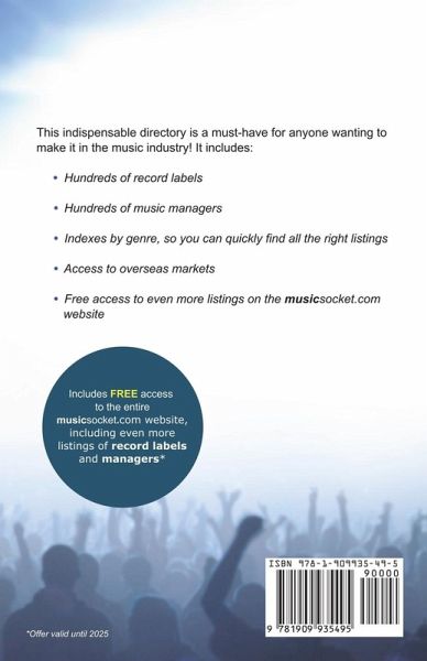 This indispensable directory is a must-have for anyone wanting to make it in the music industry. It gives you: ¿ Hundreds of record labels ¿ Hundreds of music managers ¿ Indexes by genre, so you can quickly find all the right listings ¿ Access to overseas markets It also provides free access to the entire current databases online, including over 1,200 record labels, and over 500 managers, with dozens of new and updated listings every month. Your free subscription can be taken out at any time until 2025, and comes packed with all the following features: Advanced search featuresSave searches and save time - set up to 15 search parameters specific to your work, save them, and then access the search results with a single click whenever you log in. You can even save multiple different searches if you have different types of work you are looking to place. Add personal notes to listings, visible only to you and fully searchable - helping you to organise your actions. Set reminders on listings to notify you when to submit your work, when to follow up, when to expect a reply, or any other custom action. Track which listings you've viewed and when, to help you organise your search - any listings which have changed since you last viewed them will be highlighted for your attention. Daily email updates As a subscriber you will be able to take advantage of our email alert service, meaning you can specify your particular interests and we'll send you automatic email updates when we change or add a listing that matches them. So if you're interested in labels dealing in hard rock in the United States you can have us send you emails with the latest updates about them - keeping you up to date without even having to log in. User feedback Our databases include a user feedback feature that allows our subscribers to leave feedback on each listing - giving you not only the chance to have your say about the markets you contact, but giving a unique artist's perspective on the listings. Save on copyright protection fees If you're sending your work away to record labels and managers you should first consider protecting your copyright. As a subscriber to MusicSocket you can do this through our site and save 10% on the copyright registration fees normally payable for protecting your work internationally through the Intellectual Property Rights Office (https://www.CopyrightRegistrationService.com).