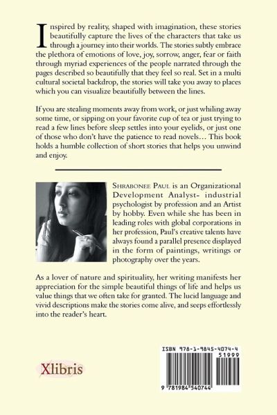 Inspired by reality, shaped with imagination, these stories beautifully capture the lives of the characters that take us through a journey into their lives . The stories subtly embrace the plethora of emotions of love, joy, sorrow, anger, fear or faith through myriad experiences of the people narrated through the pages described so beautifully that they feel so real. Set in a multi cultural societal backdrop, the stories will take you away to places which you can visualize beautifully between the lines. If you are stealing moments away from work, or just whiling away some time, or sipping on your favorite cup of tea or just trying to read a few lines before sleep settles into your eyelids, or just one of those who don't have the patience to read novels... This book holds a humble collection of short stories that helps you unwind and enjoy.