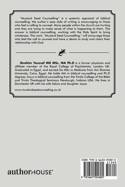 "Mustard Seed Counselling" is a systemic appraisal of biblical counselling; the author's easy style of writing is encouraging to those who feel a calling to counsel. Many people within the church are hurting and they are trying to make sense of what is happening to them. The answer is biblical counselling, working with the Holy Spirit to bring wholeness. The work, "Mustard Seed Counselling," will encourage those who feel the call to counsel and have a desire to study and check their relationship with God.