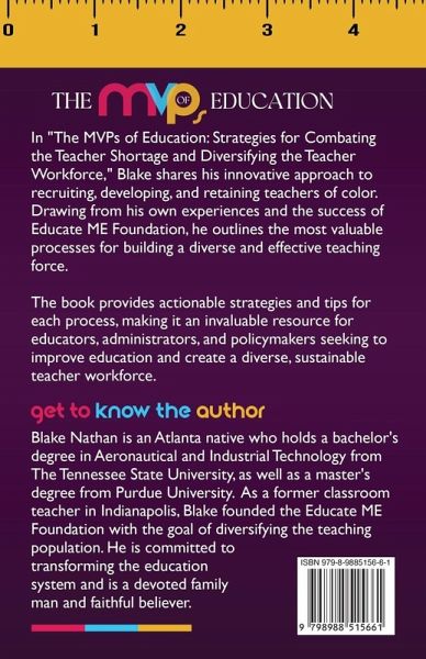 In "The MVPs of Education: Strategies for Combating the Teacher Shortage and Diversifying the Teacher Workforce," Blake shares his innovative approach to recruiting, developing, and retaining teachers of color. Drawing from his own experiences and the success of Educate ME Foundation, he outlines the most valuable processes for building a diverse and effective teaching force. The book provides actionable strategies and tips for each process, making it an invaluable resource for educators, administrators, and policymakers seeking to improve education and create a diverse, sustainable teacher workforce.