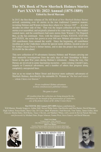 Featuring Contributions by: Will Murray, Brenda Seabrooke, Arthur Hall, Steven Philip Jones, Dan Rowley and Don Baxter, David Marcum, Hugh Ashton, Sonya Kudei, Barry Clay, DJ Tyrer, Mark Wardecker, Paul Hiscock, Tom Turley, Brett Fawcett, Martin Daley, Bob Byrne, Tracy J. Revels, James Gelter, and Matthew White, with a poem by Kevin Patrick McCann, and forewords by Michael Sims, Roger Johnson, Emma West, Steve Emecz, and David Marcum. 59 New Traditional Canonical Holmes Adventures Collected in Three Companion Volumes In 2015, the first three volumes of The MX Book of New Sherlock Holmes Stories arrived, containing over 60 stories in the true traditional Canonical manner, revisiting Holmes and Watson in those days where it is "always 1895" . . . or a few decades on either side of that. That was the largest collection of new Holmes stories ever assembled, and originally planned to be a one-time event. But readers wanted more, and the contributors had more stories from Watson's Tin Dispatch Box, so the fun continued. Now, with the release of Parts XXXVII, XXXVIII, and XXXIX, the series has grown to over 800 new Holmes adventures by over 200 contributors from around with world. Since the beginning, all contributor royalties go to the Undershaw school for special needs children, located at one of Sir Arthur Conan Doyle's former homes, and to date the project has raised over $110,000 for the school. This new collection of 59 adventures features Holmes and Watson carrying out their masterful investigations from the early days of their friendship in Baker Street to the post-War years during Holmes's retirement. Along the way, Our Heroes are involved in dozens of fascinating mysteries - some relating Untold Cases, sequels to Canonical adventures, and a number or others that progress along completely unexpected lines. Join us as we return to Baker Street and discover more authentic adventures of Sherlock Holmes, described by the estimable Dr. Watson as "the best and wisest . . . whom I have ever known."