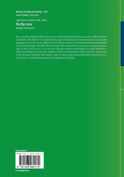 The Myc world within Reach.- Methods for the Expression, Purification, Preparation and Biophysical Characterization of Constructs of the c-Myc and Max b-HLH-LZs.- Analyzing Myc in Cell Transformation and Evolution.- Identifying Myc Interactors.- Detection of c-Myc Protein-Protein Interactions And Phosphorylation Status by Immunoprecipitation.- An Efficient Way of Studying Protein-Protein Interactions Involving HIF- , c-Myc, and Sp1.- Methods for Determining Myc-induced Apoptosis.- Methods to Study Myc-regulated Cellular Senescence.- Chromatin Immunoprecipitation Assays for Myc and N-Myc.- Methods to Quantify microRNAs in the Myc Gene Network for Posttranscriptional Gene Repression.- Genome-wide Analysis of c-MYC-regulated mRNAs and miRNAs, and c-MYC DNA-binding by Next Generation Sequencing.- A High Throughput siRNA Screening Platform to Identify MYC Synthetic Lethal Genes as Candidate Therapeutic Targets.- Investigating Myc-dependent Translational Regulation in Normal and Cancer Cells.- Studying Myc's Role in Metabolism Regulation.- Generation of a Tetracycline Regulated Mouse Model of MYC-induced T-cell Acute Lymphoblastic Leukemia.- Methods to Assess Myc Function in Intestinal Homeostasis, Regeneration and Tumourigenesis.- Detection of c-myc Amplification in Formalin-fixed Paraffin-Embedded Tumor Tissue by Chromogenic in situ Hybridization (CIHS).- Cell-Based Methods for the Identification of MYC-Inhibitory Small Molecules.