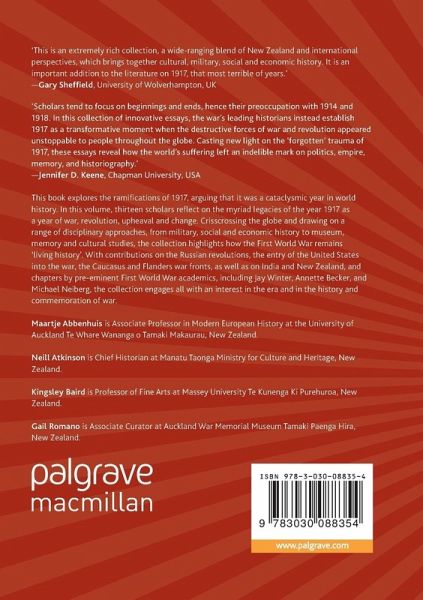 1. Introduction: Death's carnival: The myriad legacies of 1917; Maartje Abbenhuis.- 2. War and anxiety in 1917; Jay Winter.- 3. American entry into the First World War as an historiographical problem; Michael S. Neiberg.- 4. The Maori war effort at home and abroad in 1917; Monty Soutar.- 5. India's silver bullets: War loans and war propaganda, 1917-18; Radhika Singha.- 6. Artists and writers between tragedy and camouflage; Annette Becker.- 7. From Cursed Days to 'Sunstroke': The authenticity of Ivan Bunin's recollections of the Bolshevik revolution in the 1920s; Galina Rylkova.- 8.Temporary sahibs: Terriers in India in 1917; Peter Stanley.- 9. The German-Ottoman alliance, the Caucasus, and the impact of the Russian revolutions of 1917; Thomas Schmutz.- 10. New Zealand and 'the catastrophic year 1917'; Glyn Harper.- 11.1917 in Flanders fields: The seeds for the commemorative warlandscape in Belgian Flanders; Piet Chielens.- 12. Passchendaele: Remembering and forgetting in New Zealand; Jock Phillips.- 13. The forgotten break in history: The First World War and the year 1917 in German commemorative culture; Gorch Pieken.- Index.