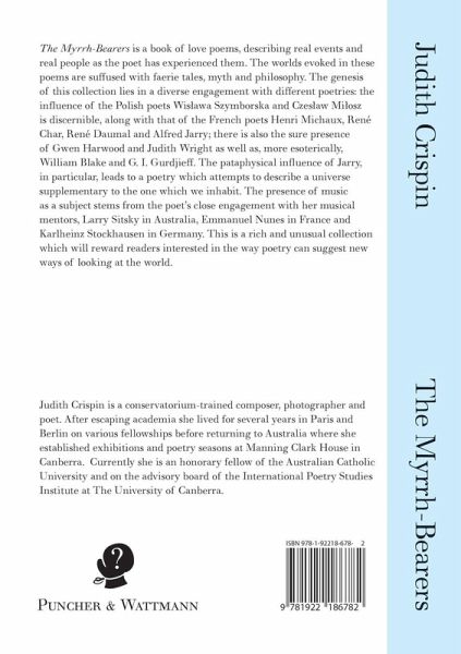 The Myrrh-Bearers is a book of love poems, describing real events and real people as the poet has experienced them. The worlds evoked in these poems are suffused with faerie tales, myth and philosophy. The genesis of this collection lies in a diverse engagement with different poetries: the influence of the Polish poets Wislawa Szymborska and Czeslaw Milosz is discernible, along with that of the French poets Henri Michaux, René Char, René Daumal and Alfred Jarry; there is also the sure presence of Gwen Harwood and Judith Wright as well as, more esoterically, William Blake and G. I. Gurdjieff. The pataphysical influence of Jarry, in particular, leads to a poetry which attempts to describe a universe supplementary to the one which we inhabit. The presence of music as a subject stems from the poet's close engagement with her musical mentors, Larry Sitsky in Australia, Emmanuel Nunes in France and Karlheinz Stockhausen in Germany. This is a rich and unusual collection which will reward readers interested in the way poetry can suggest new ways of looking at the world. Judith Crispin is a conservatorium-trained composer, photographer and poet. After escaping academia she lived for several years in Paris and Berlin on various fellowships before returning to Australia where she established exhibitions and poetry seasons at Manning Clark House in Canberra. Currently she is an honorary fellow of the Australian Catholic University and on the advisory board of the International Poetry Studies Institute at The University of Canberra.