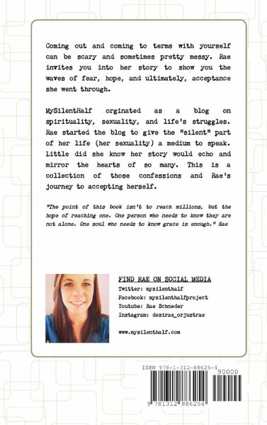 "I'm a pastor. I've read the literature. I'm still in love with a woman." - This is how author Rae Schneider started off her "MySilentHalf" blog (now book) on spirituality, sexuality, and life's struggles. Rae started the blog to give the "silent" part of her life (her sexuality) a medium to speak. Little did she know her story would echo and mirror the hearts of so many.