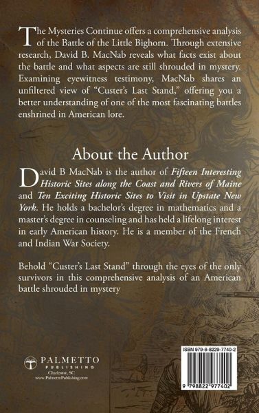 Behold "Custer's Last Stand" through the eyes of the only survivors in this comprehensive analysis of an American battle still shrouded in mystery. On June 25th, 1876, Lieutenant Colonel George Armstrong Custer led twelve companies of the 7th Cavalry to an attack on a large Sioux and Cheyenne Indian village in southeastern Montana. The result of this action was a shocking defeat for the U.S. Army and an outstanding, albeit short lived, victory for the Indians. The surprising result of the Battle of the Little Bighorn, also known as "Custer's Last Stand," was simply unheard of at the time. Coupled with the fact that there were no surviving cavalry witnesses to report what happened in middle phase of the conflict, this historic battle remains shrouded in mystery to this day. There is much we still don't know about the Battle of the Little Bighorn but what do we know? In The Mysteries Continue, American history buff, David B. MacNab clarifies what we know about the Battle of the Little Bighorn and what elements of the day's events we have yet to understand. Featuring highlights from eyewitness accounts gleaned from extensive research, the book examines the testimonies of those who did survive to offer an unfiltered view of one of the most significant victories of the Native American tribes during the Great Sioux War of 1876. An enthralling read for history enthusiasts and those with a passing interest alike, the book separates fact from myth, illuminating one of the most fascinating battles enshrined in American lore.