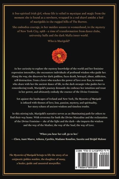 A free-spirited Irish girl, whose life is veiled in mystique and magic from the moment she is found as a newborn, wrapped in a red shawl amidst a bed of marigolds in the rugged hills of The Burren.She embodies courage, in her maiden season to womanhood, in the mystery of New York City, 1968-a time of transformation from dance clubs, university halls and the dark Mafia inner world.Who is Marigold? As her curiosity to explore the mystery knowledge of the world and her feminine expression intensifies, she encounters individuals of profound wisdom who guide her. Along the way, she discovers her dark goddess, faces death, betrayal, abuse, addiction, self-destruction. From a lover who teaches the power of love over fear, to women who share with her the ancient dance of life, to the dark stranger who guides her to remembering truth, Marigold's journey demands she embrace her intuition and trust in her power, and ultimately embody the essence of the Divine Feminine. Set against the landscapes of Ireland and New York, The Mysteries of Marigold is infused with themes of love, loss, passion, mystery, and spirituality, her story echoes of ancient wisdom and timeless truths. In this stirring tale, Marigold's narrative serves as an illuminating path for others to find their way home. With reverence for both the Divine Masculine and the reclamation of the Divine Feminine- she of the light and the dark-she imparts the wisdom and the way of the Mother, the way of the Soul, the way of Love.'When you hear her call, go to her.'-Clara, Aunt Maeve, Athena, Cynthia, Madame Rosaline, Sacnite and Brigid Malone The Mysteries of Marigold brings to life the story of an enigmatic golden maiden, the daughter of many, a healer, guide and ancestral storyteller.